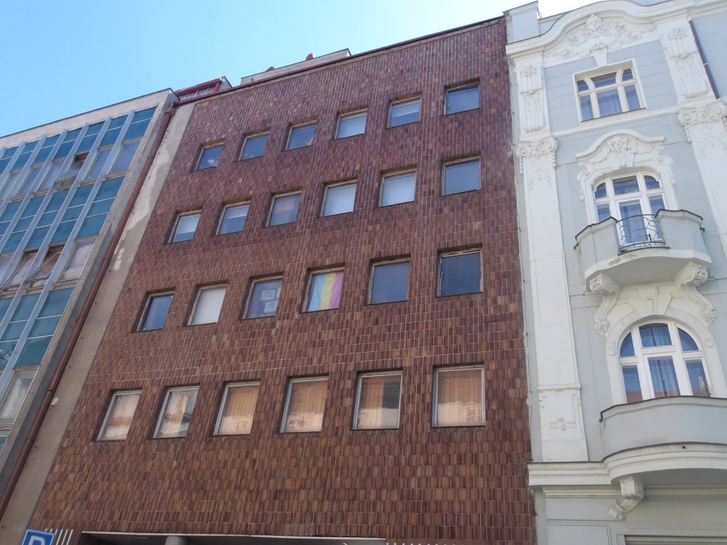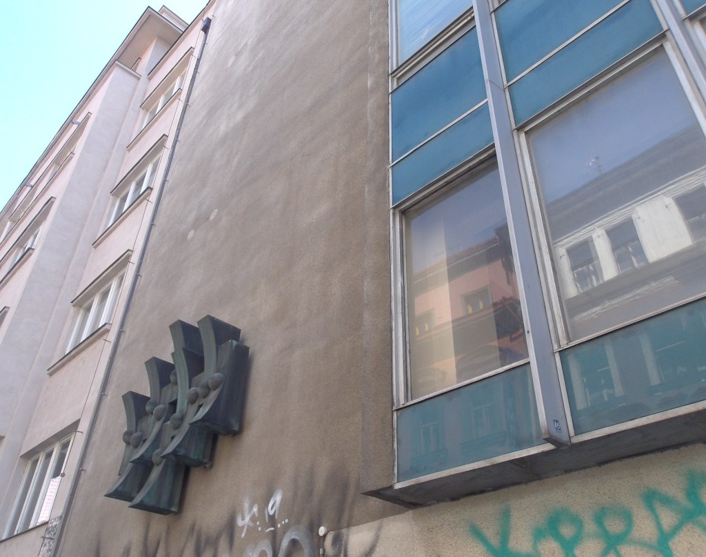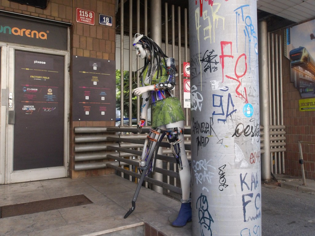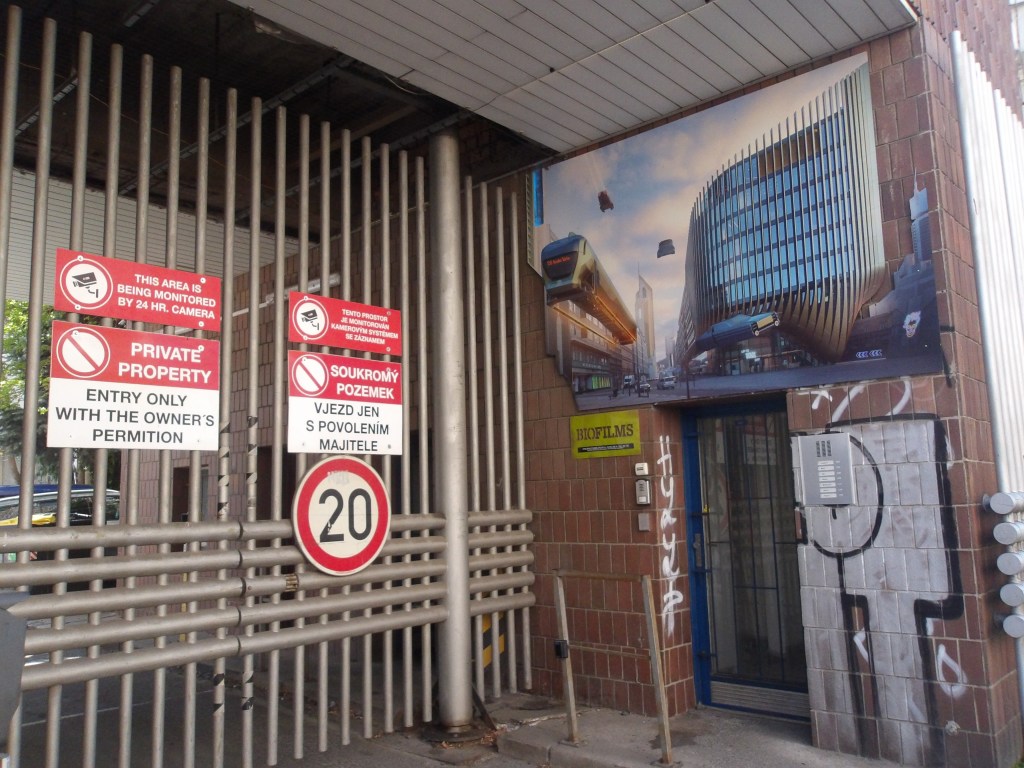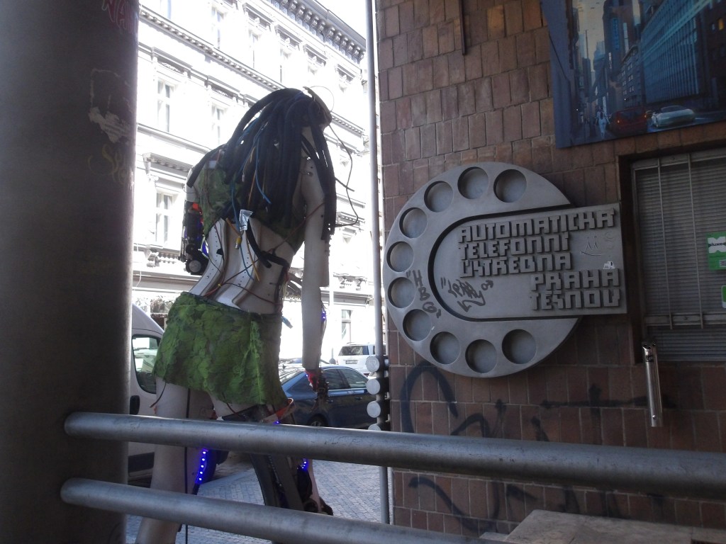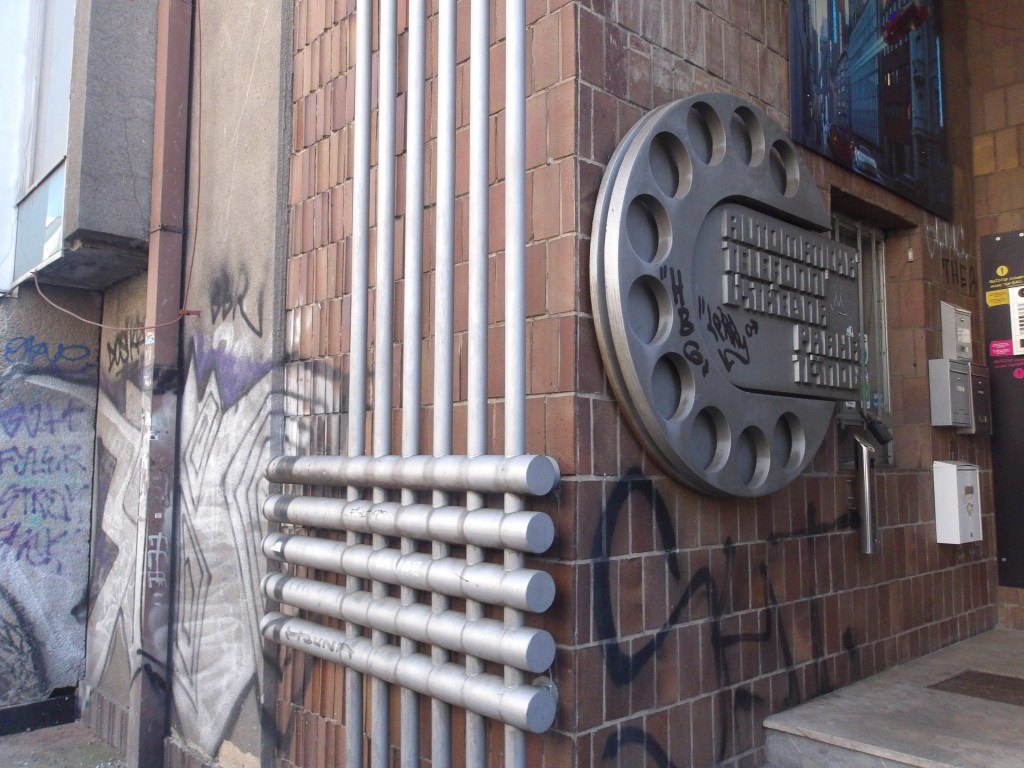 The illustrations for this review depict one of the surviving yet threatened telephone exchanges in Prague, the Těšnov exchange. Only a few steps from the land haunted by one of socialist modernity’s greatest offenses against Prague’s architectural integrity, i.e., the demolition of the Habsburg-eclectic Těšnov rail station in 1985, it too faces likely destruction. For now, its exoskeletal envelope houses a laser game, announced to the street with a sexy cyborg; could it really be Molly from Neuromancer?