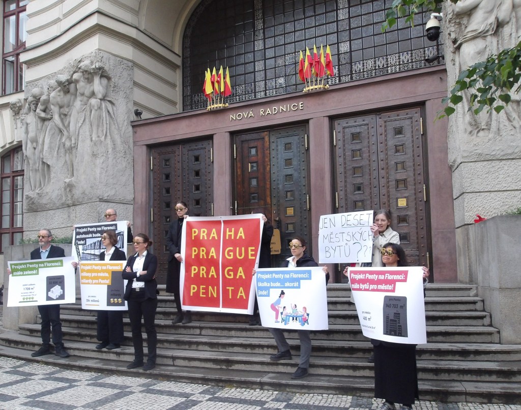 Eight-thirty on a Thursday morning: unusually cold for late May, drizzling rain slowly letting up. In front of City Hall on Prague’s Mariánské náměstí, all too often renamed by the city’s more cynical wits “Mafiánské”, a small group standing upon the steps as the council session begins. Black suits, dark glasses with dollar signs glued over the lenses, canvas banners asking questions that the city authorities somehow declined to ask.