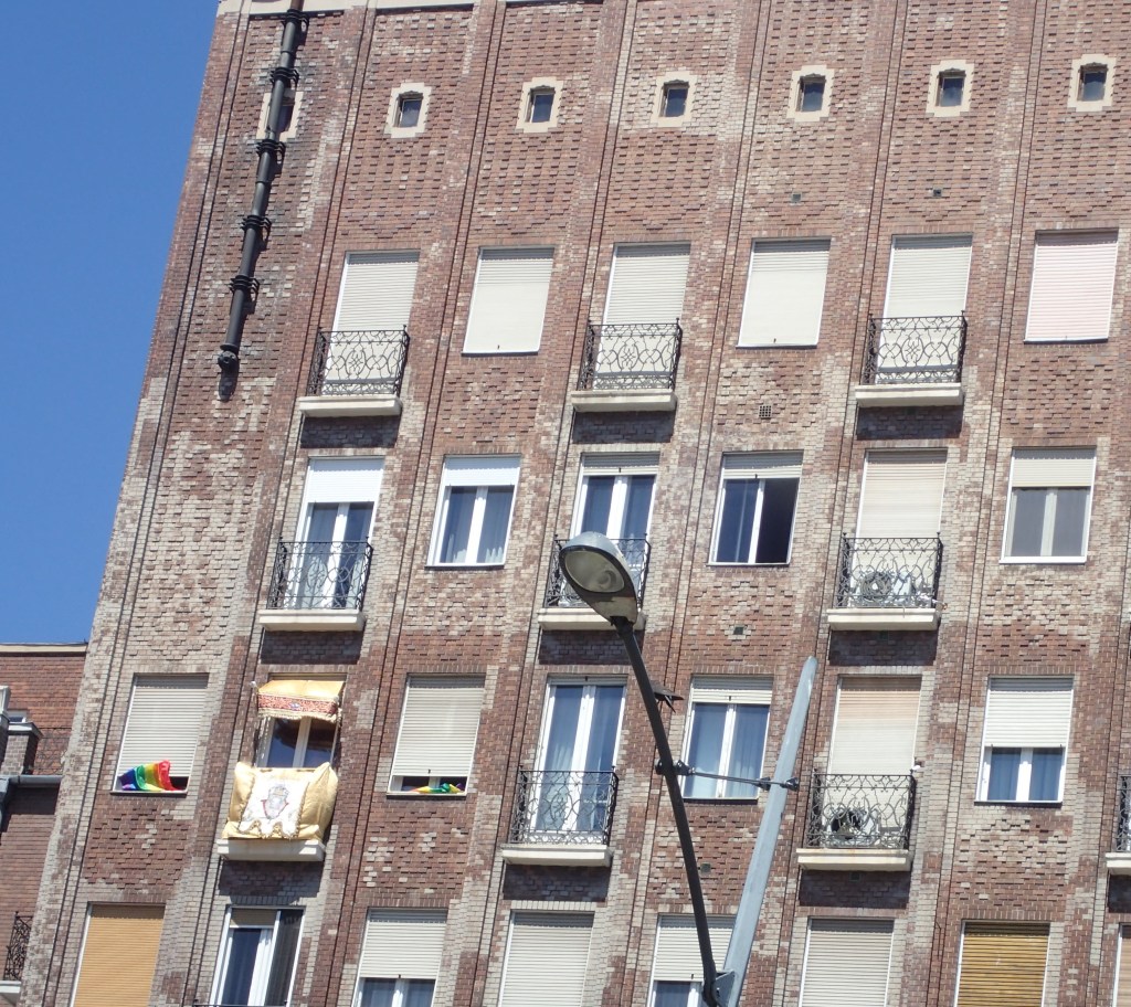 But now the crowd is visibly moving, heading along Budapest’s inner boulevard to the “Freedom Bridge” (Szabadság-híd), or so the maps indicate, then across the Danube to the embankment beside the Academy of Fine Arts. Out again into the Pannonian sunlight. The entire street is filled, ahead and back; now surging into motion. And looking upward, on the grim brick front of Madách-ház, all of a sudden I see a rainbow flag in one window. Then a second. Or a group standing on the balcony, waving their own flag and cheering.
